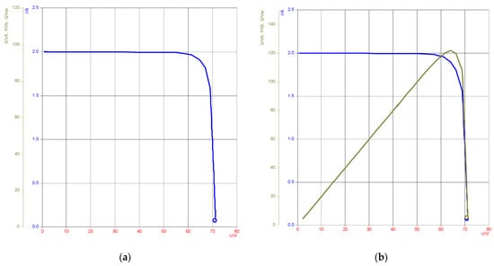 Figure 24 illustrates the I–V characteristic curve during the open-circuit and short-circuit test of the solar emulator that is used with the variable DC load and the corresponding P–V curve. The experimental results for all the following results, the I-V and P-V curves show the current label and power labels at the Y-axis and the voltage label at the X-axis.