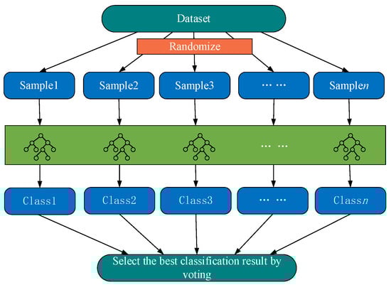 The random forest model structure diagram of Figure 1. Ref. [33] is established in this paper. Firstly, a new training sample set is generated by randomly sampling and repeated random sampling of N samples, and then N classification trees are generated according to the self-sample set to form a random forest. For each node, m features are randomly selected, and the decision of each node in the decision tree is determined based on these features. According to these m features, the optimal splitting mode was calculated [34]. Each tree will grow intact without pruning, and then all N trees will be averaged to reduce the overall model variance [35].