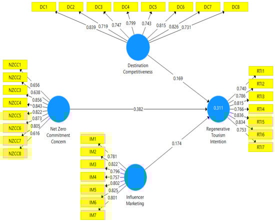 The present study employed a combination of adapted and newly developed scales (see Appendix A) to measure and test the relationships between net-zero commitment concern (NZCC), regenerative tourism intention (RTI), destination competitiveness (DC), and influencer marketing (IM). Firstly, net-zero commitment concern was measured through newly developed scale (NTCC, representing 8 items) based on prominent studies on net zero [1,3,5,6,7,8,24]. Secondly, the measures for regenerative tourism intention (RTI representing 7 items), destination competitiveness (DC representing 8 items), and influencer marketing (IM representing 7 items) were adapted from prior research that established the validity of these latent constructs [11,17,18,21,22]. All scales were pre-tested in pilot study (N = 70) after extensive review and feedback by industry practitioners (n = 2) and senior academics (n = 4). Reliability and validity estimations of all measures in the pilot testing stage were adequately validated. Hence, the collection of study data for the next stage (i.e., hypotheses testing) was accomplished in a timely manner.