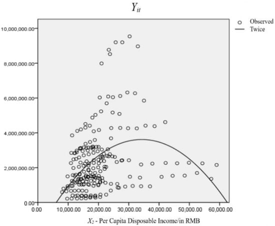 As shown in Table 5, the quadratic model passed the significance test and was extremely significant. It can be calculated that when per capita disposable income is less than 34,243.2 RMB, the degree of environmental pollution is positively correlated with the growth of disposable income, and when the degree of environmental pollution reaches the inflection point, the degree of environmental pollution is inversely correlated with the growth of disposable income.