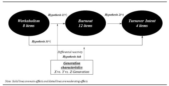 A generation can be defined as a group of people who are close in age and share important social events [57]. Because each generation has lived in different environments, the social problems and perceptions each generation experiences inevitably differ as well [58]. Conversely, the similarities among members of a generation tend to be evident, even in the way they live their lives, including their participation in the workforce [59]. Therefore, making efforts to understand the characteristics of each generation within an organization is essential to understanding organizational behavior [60]. Specifically, research on the value of labor for each generation has revealed that the value of labor is affected by generational experiences more than by age and maturity [61]. Goh and Okumus [9] stated that it is inevitable for differences to arise between generations in terms of understanding the work process and its outcomes, so a new method and approach are needed to solve this potential problem due to intergenerational differences. To elucidate intergenerational differences in workaholism’s negative effects in this study, I divided and investigated the following generations: Generation X (born 1965–1979), which was the major generation of the past, and Generations Y (born 1980–1998) and Z (born after 1999), which are the modern major generations [62,63]. In the workplace, Generation X is characterized by tendencies to place great importance on career goals, growth opportunities, and a sense of belonging or teamwork in an organization [64,65]. Generation Y pursues work autonomy, has excellent adaptability to new technologies from network experience, and values transparency in communication [55]. A number of studies have found that Generations X and Y have similar job values and share a tendency to seek challenging jobs that provide opportunities for growth, continuous skill development, and active participation in the decision-making process [66,67]. In contrast, Generation Z considers well-being the most important organizational element and places the highest value on job flexibility, values, and universality [68]. One study showed that Generation Zers who work in the hospitality industry recognize that the hospitality industry itself is an interesting sector because there are several opportunities to be in contact with diverse people, but they find it considerably difficult to experience various events that occur because of people [10]. Goh and Okumus [9] also argued that equal opportunity, equality, and fairness are the most important values that organizations must pursue for Generation Zers and that to promote this generation’s enthusiasm for the job, organizations should engage in sustainable practices. Ozkan and Solmaz [69] reported that Generation Zers seek independence at work and prefer to find joy while working. Self et al. [70] also described how Generation Zers are highly adaptable to social media, hate being interfered with regarding minor details, and want to receive feedback on their work. However, according to Robins et al. [71], young talents applying to the hospitality industry are often disenchanted with the field after their initial work or internship. Therefore, workaholism’s negative effect may be greater in the younger generation. However, despite the fact that Generation Zers play a pivotal role in the workplace, research on their general workplace attitudes has been remarkably limited. Therefore, this study hypothesizes that the degree of workaholism’s positive influence on burnout and turnover intent perceived by employees differs depending on the generation. In particular, the degree of workaholism’s negative influence would be stronger among Generation Z than among Generations X and Y.