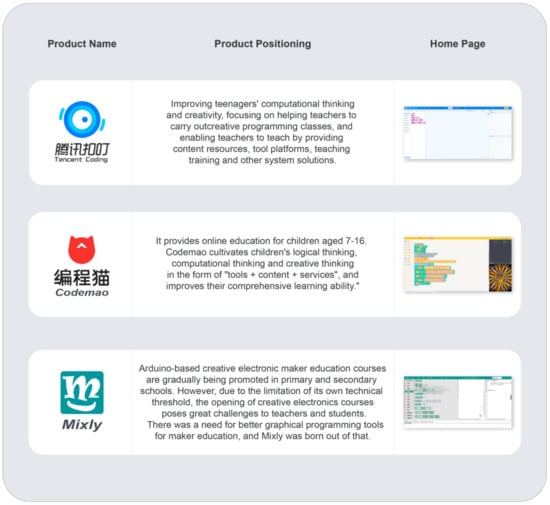 Artificial intelligence is an interdisciplinary and comprehensive field, including interdisciplinary computer science, mathematics, biology, neuroscience, cognitive disciplines, brain science, psychology, sociology, philosophy, and so on []. The strong interdisciplinary nature makes it difficult to define accurately, but as Max Tegmark’s research stated [], the rise of artificial intelligence will definitely change our future fundamentally, and we need to make this trend as controllable as possible by studying it, discussing it, and applying it. As a tool and means of communicating with computers, the cultivation of programming abilities is one of the focuses of AI education. According to Bian et al., in education relating to the development needs of AI, the cultivation of knowledge and skills such as programming ability, applied mathematical ability, data structure, algorithms, and so on is very important []. Namely, one of the most basic aspects of promoting the literacy of AI is to promote the development of students’ programming skills and thinking. Programmatic thinking can also be called computational thinking (CT)—the ability to reformulate and solve problems in ways that can be undertaken by computers—has been heralded as a foundational capability in the 21st century []. Compared with learning programming languages mechanically, computational thinking is the more important aspect for the improvement of overall programming abilities, especially for children in primary and secondary schools []. In 2020, Antonio Rodriguez-Martinez et al., analyzed the results of educating sixth graders about the use of scratch and found that graphical programming software scratch seems to be able to be used to develop both students’ mathematical ideas and CT []. The core of programming thinking is how to decompose problems, discover rules from them, build problem-solving models, map them to appropriate data structures and algorithms and then perform corresponding operations according to the algorithm. Therefore, the training of abstract thinking logic is the emphasis, rather than the memorization of programming languages.