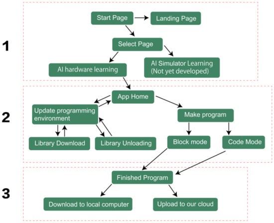 We made a new design for the Blockly–Electron software user flow. Among them, we mainly undertook the following. First, according to the needs of users, we have simplified the interaction process of the entire software, trying to make the interaction of the software more in line with user habits; second, the overall functional system of the software is examined, and the advantages of similar products on the market are learned, and the functions that should be added to the software are discussed. Third, present the new user flow to teachers, receive their opinions, and continue to refine the user flow. Through the above steps, a new user flow of the software, as shown in Figure 6, was developed. The user process of the software Blockly–Electron can be roughly divided into three steps. In the first stage, first-time users will be asked to register a personal account and fill in the corresponding pre-registration code, which is provided to the user after the user pays for the software. Then, the user enters the software entry selection page of “AI hardware learning” and “AI simulator learning”. In the software interface of “AI hardware learning”, the students mainly learn and write corresponding code instructions through the software to control AI-related hardware modules, and our laboratory also developed matching hardware to achieve the teaching goal of artificial intelligence popular science learning. In the software interface of “AI simulator learning”, the students also learn and write code, but the difference is that the student’s code is used to control specific virtual characters or objects in the software to simulate behavior. It is worth noting that the content of this set of user interfaces of “AI simulator learning” is also proposed in the redesign of the Blockly–Electron software interface, but the object of this research is mainly to redesign the software interface in “AI hardware learning”. In the second stage, on the main page of “AI hardware learning”, users can perform two operations, one is to update the programming environment by downloading and uninstalling python libraries; the second is to choose the block mode or the coding mode to write code commands. In the third stage, the finished code can be executed in two save modes, one is to download it to the user’s computer, and the other is to upload it to the cloud we developed.