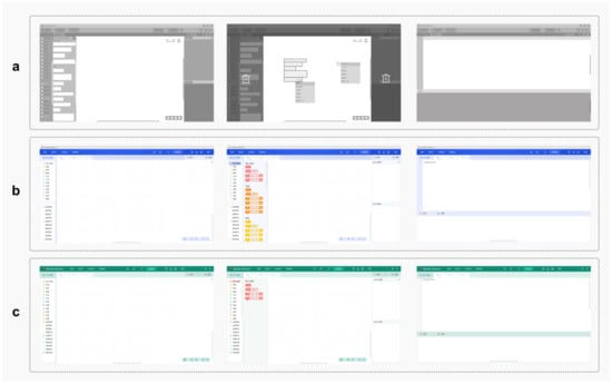 The UI prototype of Blockly–Electron. (a). Low-fidelity prototype; (b). Medi-um-fidelity prototype; (c). High-fidelity prototype of Blockly–Electron.