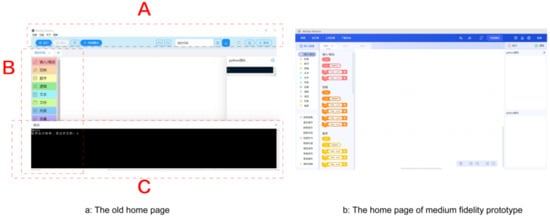 Based on the user flowchart, we further redesigned the low-fidelity prototype of the software, as shown in below Figure 7a. In this process, we implement user needs according to some interaction design principles that improve the user experience. The serial position effect is a psychological phenomenon that consists of two parts: The Primacy Effect and The Recency Effect. The series position effect theory states that users are more likely to remember the first term (first cause effect) and last term (Recency Effect) that appear in a series. Accordingly, we have specially arranged the various functional items in the main interface of Blockly–Electron in a new position, placing the more important modules of the software in the upper left and lower right corners of the entire interface. Because the common reading habits of Chinese users are from left to right, from top to bottom, according to the series of position effect theory, the items placed in the upper left and lower right corners can obtain more attention and memory. Hick’s law states that when people are faced with a choice, their reaction time depends on the number of choices, expressed in the equation RT = K log 2(N + 1), where RT is the reaction time, K is constant, and N is the number of possible choices. The implication that can be drawn from the application of interaction design is that when the software provides choices that let the user choose to achieve interaction, the options that appear in the user’s decision are reduced as much as possible, and the complexity of the options is reduced as much as possible when there are already multiple options. In this regard, when we redesigned the user interface of the Blockly–Electron software, we simplified some selection pages with many entries, especially the initial login page, and we merged unnecessary items as much as possible without affecting the functionality, simplifying the description of the original items.