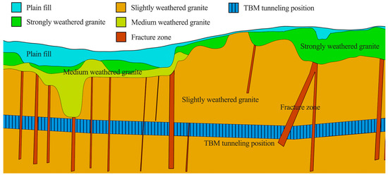 Qingdao Metro Line 8’s tunnel alignment between Jiading Shan Road Station and Anshan Road Station extends over 2459.559 m. It starts at K55 + 102.735 and ends at K57 + 562.294. The tunnel is constructed using parallel boring, with a spacing of approximately 6–10 m between them. The geology of this section is characterized by the presence of plain fill, strongly weathered granite, medium weathered granite, and slightly weathered granite strata. Groundwater is abundant and unevenly distributed, primarily consisting of pore water and fourth-system bedrock fracture water. The Cangkou fault, marked by a strike of 40°, an inclination of 310°, and dips ranging from 50 to 86°, significantly impact this section. The central section of the fault is the widest, reaching a width of 100 m. It is characterized by the development of cataclastic rocks, silty rocks, and mylonite. Multiple fracture zones, influenced by the Cangkou fault, are present in this area, as depicted in Figure 1. The section is excavated using a CSIC φ7032 double-shield TBM, which has a maximum total thrust of 19,396 kN, a maximum speed of 8.2 rpm, a maximum torque of 3947 kN·m, and a stripping torque of 6600 kN·m. The TBM cutter has 25 face cutters of 4830 mm diameter, 8 centrals, and 10 gauge cutters.