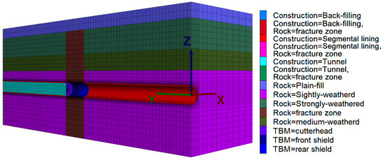 Based on the geological profile of the Jiadingshan Road–Anshan Road section, numerical models of the section containing the fracture zone were established. The models in this study were composed of layers of plain fill, strongly weathered granite, medium weathered granite, and slightly weathered granite. These models were simplified using a half-tunnel model to take advantage of symmetry. The total width of the model along X direction was set to be three to five times the tunnel diameter according to St. Venant’s principle to prevent boundary effects, resulting in a final width of 40 m. Similarly, the model’s height along the Z-direction was 60 m, with 30 m each from the tunnel axis to its top and bottom. The length of the model along Y-direction was 120 m. The diameter of the TBM excavated tunnel was 6.3 m. In addition, to make the simulation more representative of the boring process, a TBM shell unit and a liner tube sheet unit were incorporated to simulate the effects of the TBM on the tunnel. The thickness of the shield shell unit was set as 60 mm, and the thickness of the liner unit was set as 300 mm. The model’s normal displacement was limited by normal constraints around and at its bottom, with no constraint on its top. The numerical model geometry is illustrated in Figure 2.