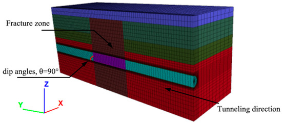 There have been many studies about the construction risk evaluation of TBM tunneling through fracture zones and technical measures to mitigate risks. Peng et al. [1] and Xue et al. [2] established the cloud models to assess water inrush risk in tunnels using geological analysis and risk assessment indicators. Both models have been verified and applied under the actual tunnel excavation conditions, which improve the accuracy of the risk assessment of water inrush in the tunnel through water-rich faults. Newman et al. [3] monitored the operating parameters, such as cutter head torque, thrust, and injection of spoil-conditioning additives. The monitoring information can be used to validate the pre-construction geological model and provide valuable assurances for the predicted ground ahead of tunneling operations. Liu et al. [4] and Li et al. [5] suggested a comprehensive prospecting method to ensure safe TBM tunneling to identify adverse geological bodies, including fractured zones and water-bearing structures. In addition, some other practical experiences and techniques, such as consolidation grouting, which have been used to overcome the challenges of TBM tunneling in fracture zones, were investigated [6,7,8]. However, although there have been considerable advancements in risk assessment and control for TBMs crossing through fracture zones, the existing methods still have some limitations: (1) These methods can only provide qualitative or semi-quantitative information, often lack the quantitative analysis and accurate results. In this case, they can only offer general guidelines for tunnel constructions in such conditions; (2) These methods frequently failed to consider the complex geological conditions and variations in tunnel design, resulting in a lack of adaptability. Therefore, further study is required to understand the influence of fracture zones on tunnel displacement and the surrounding rock’s plastic zone.