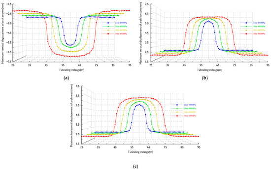 Figure 5 illustrates that the maximum displacements at the tunnel vault, invert, and haunch in the fracture zone area are significantly larger than in the non-fracture zone area. This is consistent with what was previously demonstrated. When the width of the fracture zone remains constant, an increase in the degree of fragmentation, represented by a decrease in the elastic modulus and cohesion of the fracture zone rock, results in a significant increase in the maximum displacement at the tunnel vault, invert, and haunch. As illustrated, the vertical displacement at the tunnel vault increases from 4.29 to 12.03 mm, the vertical heave of the tunnel invert increases from 4.49 to 12.33 mm, and the horizontal displacement of the tunnel haunch increases from 4.43 to 12.84 mm. Instead of impacting the width of the deformation trough, the increase in fragmentation primarily affects tunnel displacement.