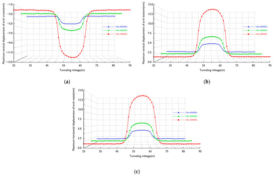To further investigate the influence of a fracture zone’s width on the stability of tunnels, numerical models with an elastic modulus of 400 MPa and cohesion of 0.55 MPa were screened. The models were utilized to statistic the maximum displacements at the tunnel vault, invert, and haunch of double-shield TBMs traversing fracture zones of varying widths. The results are shown in Figure 4.
