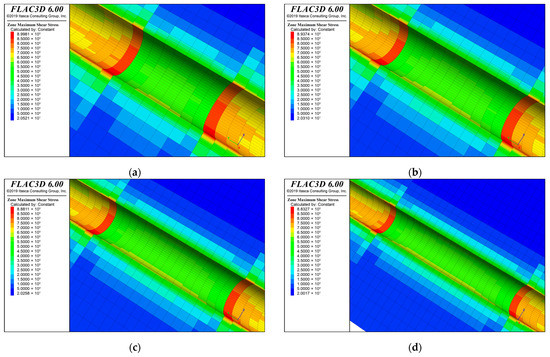 Under three-dimensional stress states, shear failure is the most prevalent failure mode for geotechnical structures. Consequently, further analysis of maximum shear stress in the surrounding rock of a double-shield TBM tunnel was conducted. It aims to reveal the effects of various levels of fracture zone deterioration on the shear stress pattern in surrounding rock. The results of this analysis are presented in Figure 6 and Figure 7. Figure 6 illustrates the variations of the maximum shear stress patterns in the surrounding rock with different fracture zone’s widths under constant fragmentation degree. By contrast, Figure 7 illustrates the variations of the maximum shear stress patterns in the surrounding rock with different degrees of fracture zone fragmentation under constant fracture zone width.