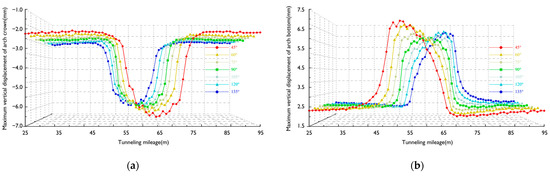 The maximum displacement and corresponding locations at the tunnel vault, invert, and haunch were obtained by conducting numerical simulations under seven different dip angles of the fracture zones (as listed in Table 4). The numerical results are summarized in Table 5. Same as above (see Section 3.2), to evaluate the surrounding rock deformation within the fracture zone, the variation profiles of the maximum displacement of the tunnel within the fracture zones and adjacent regions are shown in Figure 9.