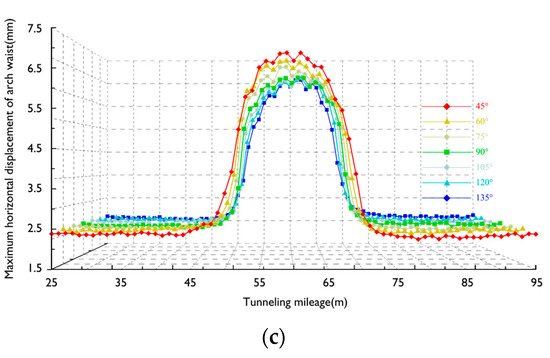 In comparison with the effect of the deterioration levels of the fracture zone (Table 3, Figure 4 and Figure 5), the dip angles of the fracture zone do not significantly affect the surrounding rock displacement at the tunnel vault, invert, and haunch (Table 5 and Figure 9). However, the variation tendencies are still obvious. Table 5 shows that as the dip angle gradually increase from 45° to 135°, a foregoing decrease and subsequent increase in deformation displacements are observed at the tunnel vault, invert, and haunch. The deformation displacements are minimal when the dip angle of the fracture zone is 90°, the minimum of which are 6.25 mm, 6.73 mm, and 6.54 mm for the tunnel vault, invert, and haunch, respectively. Unlike the variation profiles observed in varying deterioration levels of the fracture zone (Figure 4 and Figure 5), the locations of the maximum vertical displacements at the tunnel vault and invert change with dip angles of fracture zone. However, the maximum horizontal displacement of the tunnel haunch is consistently located at Y = 59 m.
