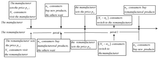 TDP strategies are widely used by sellers. Consider the switching buying behavior of consumers across periods and products; if , that is , the probability that a consumer visits the manufacturer and then buys the remanufactured product is , and the probability of consumers buying products from the manufacturer in the first period is . If , that is , the probability that a consumer visits the remanufacturer and then buys the new products is , and the probability of consumers buying products from the remanufacturer in the first period is . Then, we analyze the probability of consumers switching in the second period. Consumers waiting for the second period will buy the new products when (), and so the probability of consumers buying remanufactured products is . Similarly, the probability of consumers buying new products is .