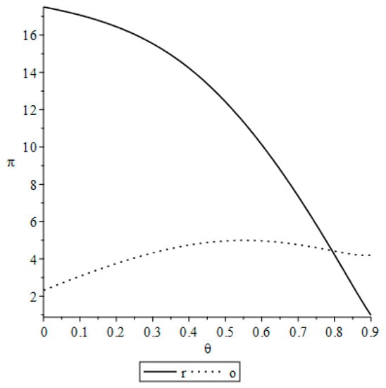 The proof of Theorem 2 is provided in Appendix A. According to Theorem 2, when there are multiple consumers, the sellers’ optimal profits can be transformed into the expected profits of the sellers when there is only one consumer in the market multiplied by the number of consumers who initially arrive at the corresponding seller. This helps us analyze the equilibrium profit of sellers. According to the above simplified procedure, , in order to ensure that the product price and the seller’s income are not negative, we randomly take the value of , and assume that . Taking “” as an example, the changes in sellers’ profits with are shown in Figure 2. In fact, taking other values of can result in similar changes in sellers’ profits.