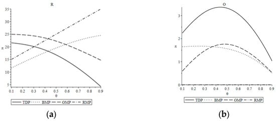 Figure 3a implies that with the increase in , the profits of the manufacturer using the TDP as well as OMP strategies decrease, while the profits of the manufacturer using the RMP as well as BMP strategies increase. Figure 3b shows that the increase in may be detrimental for the remanufacturer’s profit, especially when the profits fall to zero under the RMP strategy. With different strategies, the influence of on profits varies widely owing to the consumer’s switching behavior. Using the TDP strategy, with increases, consumers have an incentive to switch simply because of the low price of the second period, and the two sellers gradually form a symmetrical equilibrium in the competition. However, using the OMP strategy, sellers have the same price (), and consumers visiting the remanufacturer have little incentive to buy the new products; thus, the profits of the manufacturer have declined. Using the BMP strategy, the manufacturer loses some consumers, which leads to a decline in profits.