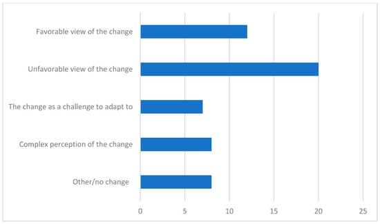 Favorable view of the change—In this category, various aspects of teaching and learning as well as experience and personal connection qualities were regarded as favorable. The replies indicated that the change was viewed as an opportunity to improve educational processes. For example, developing the students’ self-management skills, enhancing the students’ research skills, more flexible thinking in teachers, and teachers and students step out of their comfort zones.