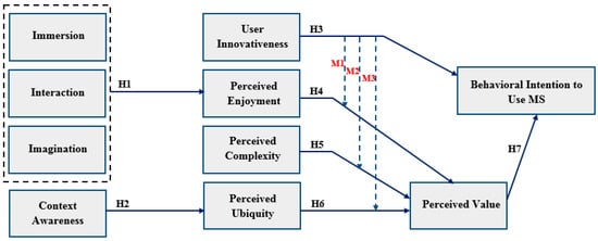 According to a previous study, it is critical to have a clear grasp of how users perceive the value of technology [8]. Some research has focused on the technology’s innovativeness as an external factor rather than a moderator factor [9,10]. More crucially, research has emphasized immersion, engagement, and imagination as three key components of the flow theory [11,12]. On the other hand, previous research has never attempted to link immersion, engagement, and imagination to perceived enjoyment and worth. On the other side, context awareness with apparent ubiquity and perceived value. Exploring the metaverse system’s creative elements by focusing on users’ inventiveness is thus a good idea.