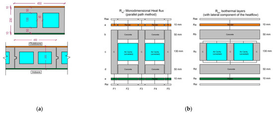 HCB-Schematic representation of the block dimensions (a) and the electrical analogy used for ISO 6946’s “simplified method” (b); all dimensions in mm.