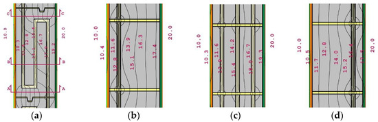FEM analysis includes the effect of mortars when solving Fourier’s law. In Figure 7, the results of the simulations show the temperature gradients across the buildup.