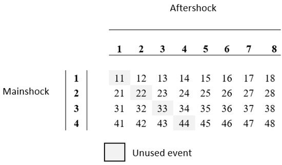 The combinations of the records to create the seismic sequences were carried out considering the four records with periods similar to the period of the mainshock of the real sequence as the mainshock and the total of the eight records as aftershocks. It is important to indicate that a seismic sequence will not be composed by the same record as mainshock and aftershock. Figure 3 shows an arrangement of the approach used to combine the records that produce a seismic sequence.