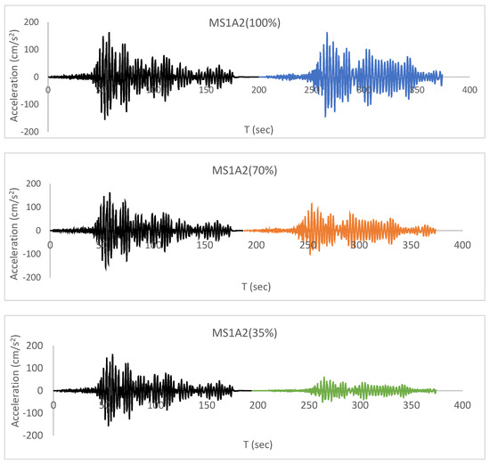The nomenclature used for the artificial sequences obtained is given by the combination of seismic records used and their scaling percentage. For example, group B seismic record MS4A5 is the seismic sequence formed by mainshock 4 (of four possible) and aftershock 5 (of eight possible); since it belongs to group B, aftershock 5 has been scaled to 70% of the maximum velocity of the original seismic record. Figure 4 shows a combination of mainshock 1 and aftershock 2 for all three escalation groups.