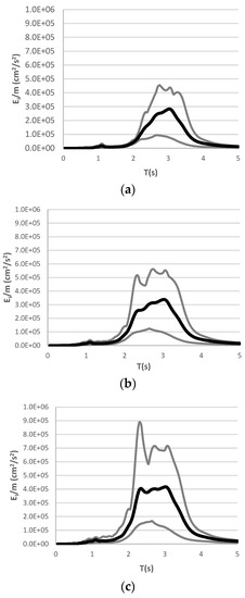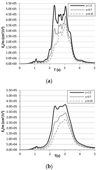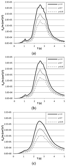 Twenty-eight response spectra were calculated for each of the three groups of seismic records and the three damping coefficients previously indicated; thus, a total of 252 spectra were obtained. The average spectra of the 28 seismic sequences for each group were computed. A total of nine average spectra were obtained, which are shown in Figure 6a (spectra with ξ = 2%), Figure 6b (ξ = 5%) and Figure 6c (ξ = 10%). In each figure, there are three spectra with different aftershock intensities (γ = 1.0, γ = 0.7 and γ = 0.35) in order to show their influence on energy demands. Note that there is a lot of similarity between each spectrum, where two important characteristics are observed. The first occurs in very short periods (T < 0.5 s) and long periods (T > 5.0 s) where the EI values are low and tend to zero for all spectra regardless of the parameters used. In other words, structures with short or very long periods will present a very low energy demand regardless of the structural characteristics or the seismic intensity. The other behavior occurs in the threshold of periods from 1.0 to 4.0 s, where the spectra present a single maximum plateau with different values in the spectral ordinate that depend directly on the intensity of the aftershock or the damping coefficient. In particular, the large energy demands occur when the structural period is very similar to the soil period. This conclusion is valid for all the structural models, damping ratios and intensities of the aftershock. On the other hand, as expected, the intensity of the aftershocks increases the demand for EI. For example, for the maximum ordinate of the spectrum of the group with γ = 1.0, the value is approximately 50% higher than the ordinate of the group of γ = 0.35; however, in the period intervals from 2 to 2.5 s, the difference can grow up to three times more, regardless of the damping coefficient used. For ξ = 5% (Figure 6b) and a period of T = 2.4 s, the EI for a spectrum with records of γ = 1.0 has a value of 400,000 cm2/s2 while for records of γ = 0.35 reaches the value of 150,000 cm2/s2, thus evidencing the large amount of energy that seismic sequences can produce on buildings with certain structural characteristics. On the other hand, the damping coefficient also has great influence on the spectral ordinate. It is observed that as the damping coefficient decreases, EI increases. In Figure 6a, the value of the maximum ordinate of the spectrum for ξ = 2% and γ = 1.0 has a value of 530,000 cm2/s2, which is 1.5 times greater with respect to the ordinate of the spectrum that has ξ = 10% and γ = 1.0, with a value of 330,000 cm2/s2 that can be seen in Figure 6c. These results are very similar to those obtained in other investigations that do not consider records with seismic sequences [28,29,30,66,67,68,69]. Finally, Figure 7 shows the average and min–max plot of the input energy spectra for a damping ratio of 5% and the three level of intensities for the aftershock. Note that there is not a large uncertainty; in addition, a similar spectral shape is observed for the three curves.