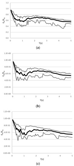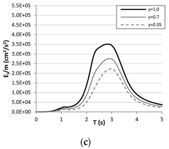 The EIμ spectra were calculated with the aim of studying the energy demands in the inelastic range. A total of 2268 response spectra and 81 average spectra were obtained with the seismic records and structural characteristics indicated above. A total of twenty-seven average spectra were plotted (Figure 8, Figure 9 and Figure 10), where it can be seen that their spectral shape is very similar to that of the EI spectra throughout the period interval, i.e., with a maximum plateau at the threshold of the ground period and with values equal to zero in very short or long periods. As in the case of EI, the aftershocks again showed a great influence on the energy demands, increasing the demand as the seismic intensity also increases. For example, the value of the EIμ for intensities of γ = 1.0 is almost two times at its maximum peak with respect to the aftershocks of γ = 0.35, as can be seen in Figure 8a–c for an elastoplastic model with a ductility value of 2 and different damping ratios, in such a way that the potential of aftershocks in the amount of inelastic energy is very important.