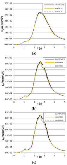 Of the structural characteristics used in the analyses, the hysteretic model does not represent a parameter that influenced the energy demands. It can be seen in more detail in the spectra of Figure 9a–c, where it is observed in each figure that the three spectra for the models—elastoplastic, bilinear 3% and 5% of post-yielding stiffness—are quite similar in their shape and spectral ordinates, concluding that post-yielding stiffness did not represent a dominant parameter in the demands of EIμ.