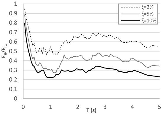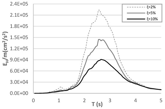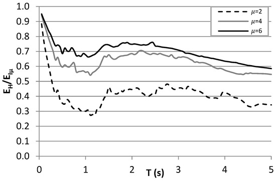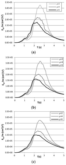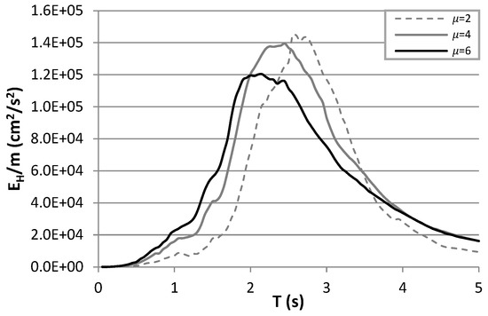 Regarding ductility, Figure 14 shows three spectra with different levels of ductility (μ = 2, μ = 4 and μ = 6). It is observed that the three spectra present the same two characteristics as the EIμ spectra according to the interval periods. The first occurs in the interval from 0.5 to 2 s and now also from 3.5 to 5 s, where, as the ductility increases, the EH will have a higher energy demand. The second characteristic is shown in the interval period from 2.5 to 3.5 s; in this case, as the ductility factor is higher, the EH will have a lower energy demand. In other words, the ductility variable plays an important role in the energy demands.