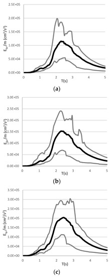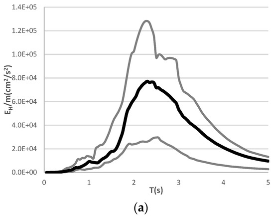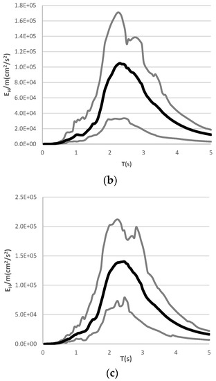 In Figure 10a–c, the influence of ductility is studied, where it is observed that two important trends stand out both in the shape and in the spectral ordinate. The first is in the period interval of approximately 1 to 2 s, where as the ductility increases, the EIμ will have a greater demand; the second is shown in the interval period from 2 to 4 s, where it is observed that as the ductility increases, the EIμ decreases, i.e., it will have a lower energy demand in a proportion of almost double, demonstrating that the ductility variable plays an important role in the energy demands. The other structural parameter analyzed is the damping coefficient, which showed less influence on the demand for EIμ with respect to EI; this is due to the fact that in the inelastic range, the EH has a preponderant value in the total input energy (see Equation (4)). On the other hand, in the elastic range, it is equal to zero, and the ED at the end of the seismic movement is equal to EI. Although its influence is less in EIμ, the characterization is the same as in the case of EI; the damping coefficient decreases as the EIμ value increases, as can be seen in each of Figure 8, Figure 9 and Figure 10. Finally, as in the case of the elastic input energy, peak values of the inelastic input energy are observed when the structural periods are very close to the soil period. Finally, the average values including the max–min plot are observed in Figure 11, for a ductility value of 4, damping ratio of 5% and the elastoplastic hysteretic model.