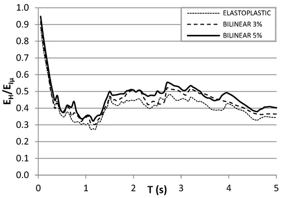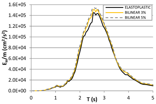 On the other hand, analyzing how the hysterical model influences the EH response, Figure 13 shows three EH spectra for the elastoplastic, bilinear 3% and 5% of post-yielding stiffness models, where it is observed that the spectra are practically the same in shape and spectral ordinate throughout the interval periods. This characterization is very similar to that of the EIμ spectra. It can be concluded in this study that the influence of the post-yielding stiffness in the assessment of EH is negligible.
