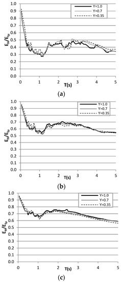 Average spectra of EIμ for different aftershock intensities, γ = 1.0, γ = 0.7 and γ = 0.35, and different damping coefficients, (a) ζ = 2%, (b) ζ = 5% and (c) ζ = 10%, calculated from the twenty-eight EIμ spectra with a ductility μ = 2 and an elastoplastic model.