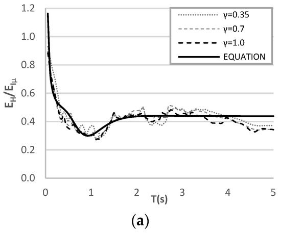 Once the EIμ and EH spectra have been obtained, the EH/EIμ ratio spectra are calculated, which will serve as the basis for proposing a simplified expression to directly compute the EH/EIμ ratio in nonlinear structures, taking into account seismic sequences with different aftershock intensities and certain structural parameters. A total of 2268 response spectra and 81 average spectra were calculated of the total average spectra. A total of 18 spectra were plotted, which are presented in Figure 17, Figure 18, Figure 19 and Figure 20, where the units of the spectral ordinate are dimensionless, and the abscissa is the period in seconds. Analyzing the characteristics of the spectral shape, it is observed that all the spectra are very similar to each other, presenting an almost constant trend with a value less than the unit along the entire abscissa axis regardless of the aftershocks’ intensities or the structural features used. These results are very similar to those found by most authors where, in their studies, they do not consider the aftershocks’ effect [28,29,30]. A ductility of μ = 2, μ = 4 and μ = 6 was used in Figure 17a–c. In each figure, the same elasto-perfectly-plastic hysteretic model was used with ζ = 5%, and three spectra were presented for different aftershock intensities (γ = 1.0, γ = 0.7 and γ = 0.30) in order to analyze the influence of aftershock intensities on the EH/EIμ response. It is observed that both the shape and the values of the spectral ordinate are very similar throughout the interval of the abscissas, showing little or no influence of the aftershocks on the ratio of EH/EIμ. The fact that aftershock intensities do not influence the EH/EIμ response does not mean that they should not be taken into account, since as previously observed in the response of the EIμ and EH (see Figure 8 and Figure 12), their influence is quite significant. Regarding the structural characteristics, in Figure 18, three spectra are presented for the models, elastoplastic, bilinear 3% and 5% post-yielding stiffness, in order to observe how the hysteretic model (post-yielding stiffness) influences the EH/EIμ ratio. It can be seen that the same almost linear shape is kept in the three spectra, and the values of the spectral ordinate are very similar throughout the entire interval period, showing little or no influence of the post-yielding stiffness on the response of the ratio EH/EIμ.