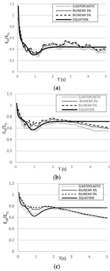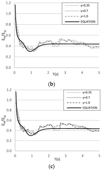Comparison of the average spectra of EH/EIμ for the aftershock magnitudes of γ = 0.35, γ = 0.7 and γ = 1.0 and spectra of EH/EIμ of the proposed Equation (5), with a ductility of μ = 2, a damping coefficient of ζ = 5% and the hysteretic models: (a) elastoplastic, (b) bilinear 3% and (c) bilinear 5%.