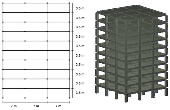 With the aim to observe the energy ratio EH/EI for MDOF structures, a reinforced-concrete (RC) building model is subjected to seven seismic sequences. The 10-story RC building was used previously in a study developed for some of the authors [55]. The RC designed according to the Mexico City Seismic Design Provisions (MCSDP) has three seven-meter bays in both horizontal directions and story heights of 3.5 m (see Figure 24). It was considered that the elements (beams and columns) of the structures have a hysteretic behavior similar to the modified Takeda model to represent the nonlinearity of the material. The period of vibration of the structural model is equal with 0.98 s. In the case of the seismic sequences, they were obtained with the records number one of Table 4 and the other seven records have been used as aftershocks (a total of seven seismic sequences). The well-known incremental dynamic analysis was used to obtain the energy ratio at different intensity levels. For this aim, while the mainshock was scaled from 0.1 g to 2 g of the spectral acceleration at first mode of vibration of the structure Sa(T1), at this scaling level of the mainshock, the aftershock was scaled to four different PGA levels. Thus, 0.25, 0.5, 0.75 and 1 times the PGA of the mainshock were selected for the PGA of the aftershock. The results of the average energy ratio at each intensity level are observed in Figure 25. The figure suggests as a preliminary result that the energy ratio is not influenced by the intensity level of the aftershocks as in the case of SDOF structures. Note that it corresponds to the preliminary results and more studies are required to better understanding of the effect of aftershock on hysteretic energy and energy ratio of MDOF structures.