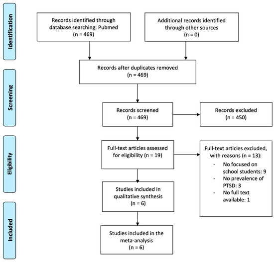 Figure 1 shows the flowchart of the search strategy and study selection process. A total of 469 records were initially identified from Medline via PubMed, of which 450 records were excluded after a first screening of the titles and abstracts. After reading the remaining 19 articles in full, we finally included 6 in our meta-analysis [63,64,65,66,67,68]. The reasons for the exclusion of articles are detailed in Figure 1.