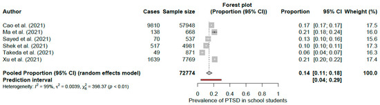 Prevalence rates ranged from 6% [67] to 21% [64] (Table 1). We estimated the overall prevalence of PTSD to be 14% (95% CI: 11–18%), with significant heterogeneity in the sample of studies (Q test: p < 0.01; I2 = 98.7%) (Figure 2). The prediction interval showed that the proportion of PTSD in future similar studies would range between 4% to 29% (Figure 2).