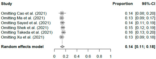 Excluding studies one by one from the analysis did not substantially change the pooled prevalence of PTSD, which varied between 13% (95% CI: 9–18%), with Xu et al. [68] excluded, and 15% (95% CI: 12–19%), with Shek et al. [66] excluded (Figure 3). This indicates that no single study had a disproportional impact on the overall PTSD prevalence.