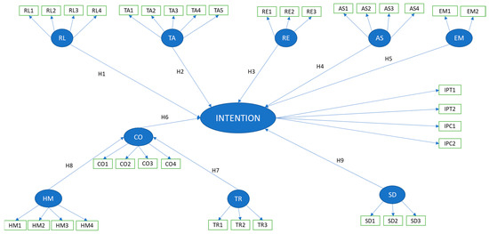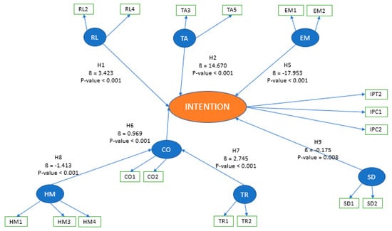 Figure 2 illustrates the study’s conceptual model based on the hypotheses outlined in Section 3.1. The proposed model focuses on the intention as its goal with five service quality variables: reliability (RL), tangibility (TA), responsiveness (RE), assurance (AS), and empathy (EM). Furthermore, in the service quality variable, variables related to health and policies for handling the transmission of the COVID-19 virus, such as confidence (CO), health measures (HM), tracing apps (TR), and social distancing (SD) are incorporated. Thus, the findings from the proposed model would review how these variables are related to the intention to use public transportation during this pandemic. The model is applied to both Jakarta and Bangkok datasets.