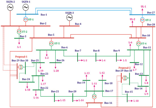 The RVPN transmission network in the Sirohi area was considered for this study. RVPN is considered the state transmission utility (STU) of Rajasthan, India. The practical transmission network owned by RVPN is elaborated in Figure 1 [17]. The RVPN transmission network is operated at voltage levels of 132 kV, 220 kV, 400 kV, and 765 kV [17]. Details such as transmission line circuit length, generation capacity, and transformer capacities are available in [17,18] and were used for this study. The test network consists of a total of 28 nodes. Of these, 2 nodes are maintained at 400 kV voltage, 6 nodes are maintained at 220 kV voltage, and 20 nodes are maintained at 132 kV voltage. Bus-29 and bus-30 were considered for the proposed restructuring; they are operated at voltages of 220 kV and 132 kV, respectively. The recorded peak loads on grid substations (GSSs) were captured and a load of 498.33 MW was considered for the test network for base year 2021. Further, the export of power from the test network was equal to 1123 MW, which flows through a 400 kV double circuit (D/C) transmission line from node-1 to node-27. Utility loads represented by utility load (UL)-1 and UL-2 indicate the power which flows out from the test network through transmission lines connecting the test system to the external transmission network, considering a scenario of average load. Aluminum conductor steel-reinforced (ACSR) twin moose conductors are utilized for all 400 kV power transmission lines, ACSR zebra conductors are utilized for 220 kV lines, and ACSR panther conductors are utilized for 132 kV transmission lines in the test network. Technical details of the conductors used in the transmission lines are reported in [19]. Three generators are used in the test network, which are connected to buses-1, -2, and -4 and designated as utility generator (UGEN)-1, UGEN-2, and UGEN-3, respectively. The power that flows out of the test network is indicated by loads. These loads are designated utility grid load (UL)-1 and UL-2, which are connected at bus-27 and bus-28, respectively. The utility generators utilized in the study were modeled using thermal power plants (TPPs). Since the test network is part of a large-area practical utility network, it is difficult to evaluate all parameters in per unit (pu) values. Hence, absolute values were considered for all parameters used in this study. The outcomes of the study are independent of the type of parameters, whether they are given on an absolute value or per unit basis.