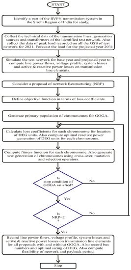 The proposed methodology of network restructuring and GOGA used for the study of loss minimization and flexibility enhancement is elaborated in Figure 2. A part of the RVPN transmission network in the Sirohi area of India was used to perform the study. Technical data related to the power transmission lines, ICTs, and generators of test network were collected. The peak loads measured on all GSSs of the test system were taken for the years 2018, 2019, 2020, and 2021. Load projections were evaluated for the forecasted year 2031 via application of the method described in Section 3. The test system was designed using MATLAB and all case studies were simulated by applying the Newton Raphson load flow approach for computing power transmitted through transmission lines, voltage profiles of every node of the test network, network loss, and loss from every transmission element. Two proposals of network restructuring, including optimal sizing as well as the placement of DEG units using the proposed GOGA, and assessment of flexibility are described in the subsections below.