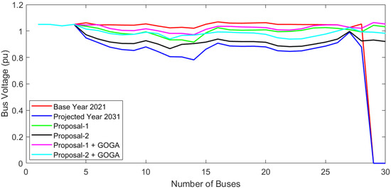 The voltage profiles for all network nodes considered for the networks of all case studies are elaborated in Figure 6. It can be seen that for the base year condition, voltages at all nodes were maintained within permissible limits. For the forecasted year, voltages were reduced drastically and violated the allowed voltage limits. This is due to enhanced loads of buses, causing overloading of power transmission lines as well as transformers. Restructuring of the network using the proposal-1 network improved the voltages. Furthermore, voltages at most nodes were within permissible limits. Restructuring of the network using the proposal-2 network also improved the voltages. However, at most of the buses this improvement was relatively small compared to the proposal-1 network. Further improvement of voltages was also observed following optimal deployment of DEG units in the networks considered for both proposal-1 and proposal-2. The maximum voltage profile improvement was observed for the test network considered for proposal-1 with DEG placement using GOGA.