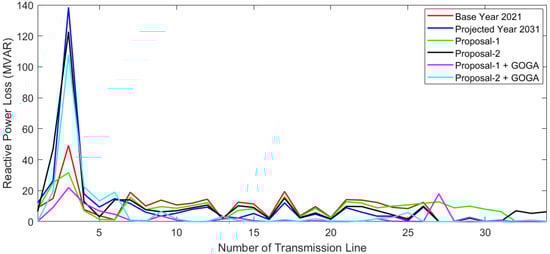 The losses of active power from each transmission line of the network of all study cases are elaborated in Figure 7. This shows that the transmission line losses for the base year condition were small, and that these increased to a very high level for the network corresponding to the forecast year 2031. This was due to a heavy increase in the load of the network in the projected year condition. These losses were decreased by restructuring of the network using PNR-1 and PNR-2. The losses were further reduced by the placement of DEG units using GOGA for the networks of PNR-1 and PNR-2. The minimum losses were observed for the PNR-1 network with the placement of DEG units using GOGA.