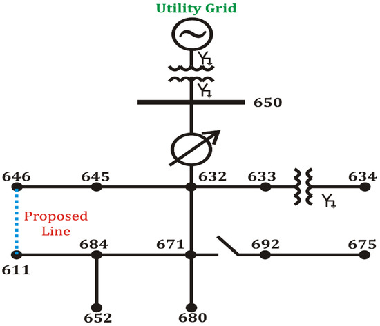 Maximum loads of the test system measured for four consecutive years are included in Table 1 [20]. From this, it was inferred that load is increasing day by day and the rate of annual load growth (RALG) is also increasing. The measured peak loads and RALG were utilized to forecast the load for the year 2031 by application of the least-square approximation approach. A curve-fitting technique was utilized to find the best-fit linear approach with the help of the least-square approximation method for the forecasting of load. The mathematical formulation of the least-square approximation technique reported in [21,22] was implemented. The linear-fit mathematical formulation used to compute the projected load (PL) for the year 2031 is shown in Equation (1). Load projections for the system load and loads on every node of the test network were computed. Equation (1) was used to project the system load, which was 737.86 MW for the year 2031. Furthermore, the load projections for the individual loads for the projected year 2031 were computed by multiplying the load by a load factor of 1.480665423. This factor was computed as the ratio of the system load for the projected year to the system load for the base year (737.86/498.33). Loads UL-1 and UL-2 were kept constant, as these loads indicate the outflow of power from the test network.