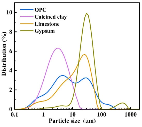 The ordinary Portland cement (OPC) clinker used in this study was obtained from Zhejiang Xindu Cement Co., Ltd. in Jiaxing, China, and limestone (LS) and gypsum were acquired from Tonglu South Cement Co., Ltd., in Tonglu, Hangzhou, China. Clay was purchased from Shangxing Chemical Technology Co., Ltd., in Maoming, China. Calcined clay (CC) was obtained by calcination at 750 °C and holding for 1 h. Figure 1 shows the particle size distributions of the raw materials.