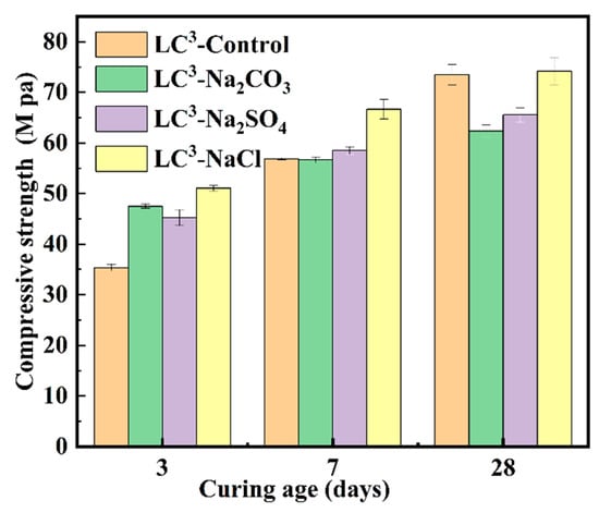 Figure 2 shows the effect of inorganic salt on the compressive strength of LC3. The strengths of the LC3 blank group were 35.4, 56.9 and 73.5 MPa after 3, 7 and 28 days, respectively. The addition of inorganic salt significantly increased the early strength of LC3. At 3 days, the addition of sodium carbonate, sodium sulfate, and sodium chloride increased the strength of LC3 by 38%, 28% and 44%, respectively, and the improvement effect was obvious. At 7 days, the compressive strength of LC3-NaCl still increased by 17%, while the compressive strength of LC3-Na2CO3 and LC3-Na2SO4 remained basically unchanged compared with the control group. At 28 days, sodium carbonate and sodium sulfate showed a 15% and 10% reduction in the compressive strength of LC3, respectively, and only LC3-NaCl was similar to that of the control group. Obviously, the addition of three kinds of dissoluble inorganic salts can significantly improve the early strength, the mechanism of which will be discussed in the following article.