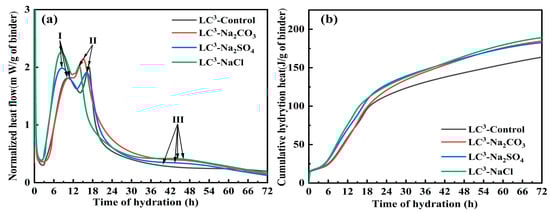 Figure 3b shows the cumulative hydration heat curve of the binder over 72 h. Compared with LC3-control, the cumulative heat release curves of LC3-Na2SO4 and LC3-NaCl are always in a leading position after the induction period, and the same is true of the cumulative heat release of LC3-Na2CO3 after the aluminate reaction. In general, the addition of three dissoluble inorganic salts to LC3 improved the cumulative heat release and increased the hydration of the binder, which was also consistent with the improvement in the compressive strength of LC3 at 3 days. Therefore, in Figure 2, LC3-Na2CO3, LC3-Na2SO4 and LC3-NaCl have better compressive strength than the control group after 3 days.