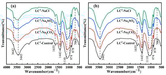 Figure 5 shows the FTIR spectra of the samples in the scan range of 500–4000 cm−1 at 3 days and 28 days. The absorption peaks near 3642 cm−1 can be attributed to the vibrations of the OH bond of portlandite [40]. At 3 days, the absorption peak of CH of LC3-Na2CO3 was smaller than that of the other groups with added inorganic salt because the enhanced pozzolanic reaction increased the CH consumption. However, the absorption peak of CH was also not significant in the LC3-control group, which may be due to sample carbonation during the experimental stage, leading to the consumption of CH [27]. This is also reflected in the later O-H of water transformation. The absorption peaks at 3443 and 1670 cm−1 represent the stretching and bending vibrations of the O–H bond of chemically combined water, respectively [40]. At 3 days, LC3-Control carbonation took place, and H-O-H at approximately 1670 cm−1 shifted to a smaller peak at 1650 cm−1. The absorption peaks at 1433 and 878, 706 cm−1 are related to the asymmetric stretching vibration and bending vibration of C-O bonds, respectively [21]. The absorption peaks at 706 cm−1 can be attributed to limestone, where the peaks of LC3-Na2CO3 and LC3-NaCl were more prominent because they produced nanometre calcium carbonate and left more unreacted limestone, respectively. The absorption peaks at 1433 cm−1 of LC3-Na2CO3 were higher than those of the other samples due to additional Hc and Mc. The absorption peaks at 1110 cm−1 correspond to the SO42− of ettringite [30]. The absorption band intensity of LC3-Na2SO4 was strengthened, which was caused by the additional ettringite. The absorption band at 974 cm−1 corresponds to the in-plane stretching vibration of the Q2 tetrahedra in C-A-S-H [27]. As shown in Figure 5b, the largest difference between the 28 days FTIR and the 3 days FTIR of the samples was that the absorption peaks at 3443 cm−1 and 1443 cm−1 were enhanced. This may be due to the production of more C-A-S-H gel and carboaluminates, respectively, with hydration.