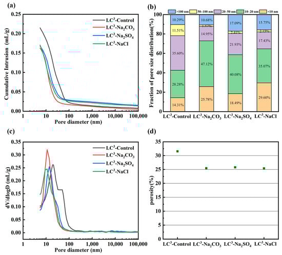 Figure 6 shows the MIP results of LC3-Control, LC3-Na2CO3, LC3-Na2SO4 and LC3-NaCl paste at 3 days [27,41]. Figure 6a shows that at 3 days, the pore volume of all LC3 samples with the addition of inorganic salts is smaller than the pore volume of LC3-control. According to the hydration heat evolution of the samples, the addition of three kinds of inorganic salts accelerates the hydration of LC3 in different ways, resulting in the production of more hydration products such as C-(A)-S-H gel, CO3-AFm, ettringite and Friedel’s salt. Additional hydration products can fill the pores and form a denser structure [34,41,42,43]. Figure 6d further illustrates the porosity variation of the samples [44]. Adding Na2CO3, Na2SO4 and NaCl can reduce the MIP porosity from 31.55% to 25.46%, 25.77% and 25.39%, respectively, with a drop of approximately 20%. Because the smaller the porosity, the denser the structure, the greater the compressive strength of the sample, so the sample with inorganic salts has a higher early strength in Figure 2. Figure 6b,c show the change in the pore size of the sample in further detail. According to the pore size distribution curves, the peaks of the pore size distribution curves of the samples moved in the direction of small pore size after inorganic salts were added. The pore size percentages of different samples were analysed, and it was found that the percentage of pore sizes in the range of 20–50 nm and 50–100 nm was greatly reduced after the addition of inorganic salts, while the percentage of pore sizes below 20 nm was greatly increased. In particular, the pore sizes less than 10 nm in LC3-Na2CO3 and LC3-NaCl were 25.78% and 29.6%, respectively. This also demonstrates that additional CO3-AFm and Cl-AFm were produced, which greatly refined the pore size. The percentage of pore size less than 20 nm of LC3-Na2CO3 far exceeds that of the other groups, reaching approximately 73% of pore sizes less than 20 nm. A previous study [20] showed that Na2CO3 refine the pore size in cement. However, as described in the literature [24], rapid porosity refinement would affect the subsequent precipitation of Hc and Mc, which would have a detrimental effect on the later pozzolanic reaction of metakaolin.